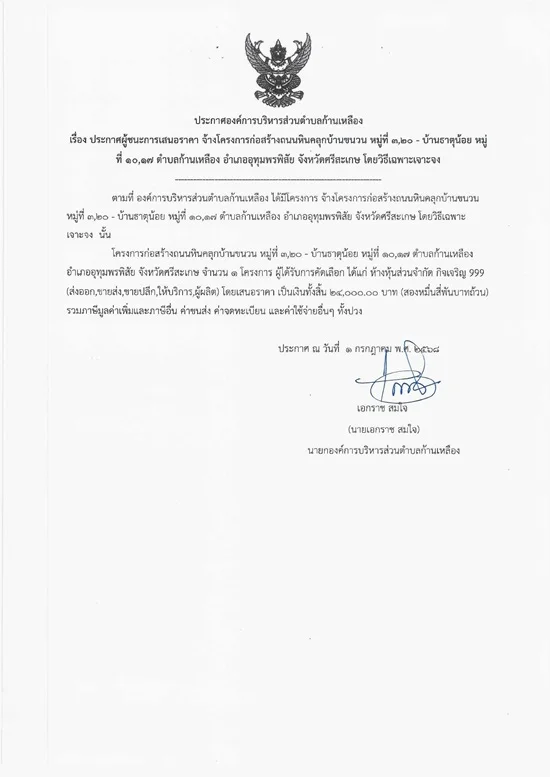 āļ›āļĢāļ°āļāļēāļĻāļ­āļ‡āļ„āđŒāļāļēāļĢāļšāļĢāļīāļŦāļēāļĢāļŠāđˆāļ§āļ™āļ•āļģāļšāļĨāļāđ‰āļēāļ™āđ€āļŦāļĨāļ·āļ­āļ‡ āđ€āļĢāļ·āđˆāļ­āļ‡ āļ›āļĢāļ°āļāļēāļĻāļœāļđāđ‰āļŠāļ™āļ°āļāļēāļĢāđ€āļŠāļ™āļ­āļĢāļēāļ„āļē āļˆāđ‰āļēāļ‡āđ‚āļ„āļĢāļ‡āļāļēāļĢāļāđˆāļ­āļŠāļĢāđ‰āļēāļ‡āļ–āļ™āļ™āļŦāļīāļ™āļ„āļĨāļļāļāļšāđ‰āļēāļ™āļ‚āļ™āļ§āļ™ āļŦāļĄāļđāđˆāļ—āļĩāđˆ 3,20 - āļšāđ‰āļēāļ™āļ˜āļēāļ•āļļāļ™āđ‰āļ­āļĒ āļŦāļĄāļđāđˆāļ—āļĩāđˆ 10,17 āļ•āļģāļšāļĨāļāđ‰āļēāļ™āđ€āļŦāļĨāļ·āļ­āļ‡ āļ­āļģāđ€āļ āļ­āļ­āļļāļ—āļļāļĄāļžāļĢāļžāļīāļŠāļąāļĒ āļˆāļąāļ‡āļŦāļ§āļąāļ”āļĻāļĢāļĩāļŠāļ°āđ€āļāļĐ āđ‚āļ”āļĒāļ§āļīāļ˜āļĩāđ€āļ‰āļžāļēāļ°āđ€āļˆāļēāļ°āļˆāļ‡