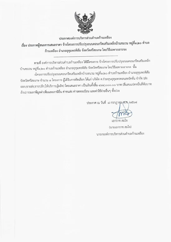 āļ›āļĢāļ°āļāļēāļĻāļ­āļ‡āļ„āđŒāļāļēāļĢāļšāļĢāļīāļŦāļēāļĢāļŠāđˆāļ§āļ™āļ•āļģāļšāļĨāļāđ‰āļēāļ™āđ€āļŦāļĨāļ·āļ­āļ‡ āđ€āļĢāļ·āđˆāļ­āļ‡ āļ›āļĢāļ°āļāļēāļĻāļœāļđāđ‰āļŠāļ™āļ°āļāļēāļĢāđ€āļŠāļ™āļ­āļĢāļēāļ„āļē āļˆāđ‰āļēāļ‡āđ‚āļ„āļĢāļ‡āļāļēāļĢāļ›āļĢāļąāļšāļ›āļĢāļļāļ‡āļ–āļ™āļ™āļ„āļ­āļ™āļāļĢāļĩāļ•āđ€āļŠāļĢāļīāļĄāđ€āļŦāļĨāđ‡āļ āļšāđ‰āļēāļ™āļ‚āļ™āļ§āļ™ āļŦāļĄāļđāđˆāļ—āļĩāđˆ 3,20 āļ•āļģāļšāļĨāļāđ‰āļēāļ™āđ€āļŦāļĨāļ·āļ­āļ‡ āļ­āļģāđ€āļ āļ­āļ­āļļāļ—āļļāļĄāļžāļĢāļžāļīāļŠāļąāļĒ āļˆāļąāļ‡āļŦāļ§āļąāļ”āļĻāļĢāļĩāļŠāļ°āđ€āļāļĐ āđ‚āļ”āļĒāļ§āļīāļ˜āļĩāđ€āļ‰āļžāļēāļ°āđ€āļˆāļēāļ°āļˆāļ‡
