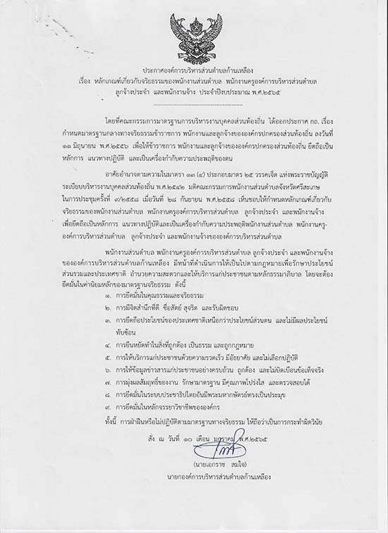āļ›āļĢāļ°āļāļēāļĻāļ­āļ‡āļ„āđŒāļāļēāļĢāļšāļĢāļŦāļēāļĢāļŠāđˆāļ§āļ™āļ•āļģāļšāļĨāļāđ‰āļēāļ™āđ€āļŦāļĨāļ·āļ­āļ‡ āđ€āļĢāļ·āđˆāļ­āļ‡ āļŦāļĨāļąāļāđ€āļāļ“āļ‘āđŒāđ€āļāļĩāđˆāļĒāļ§āļāļąāļšāļˆāļĢāļīāļĒāļ˜āļĢāļĢāļĄāļ‚āļ­āļ‡āļžāļ™āļąāļāļ‡āļēāļ™āļŠāđˆāļ§āļ™āļ•āļģāļšāļĨ āļžāļ™āļąāļāļ‡āļēāļ™āļ„āļĢāļđāļ­āļ‡āļ„āđŒāļāļēāļĢāļšāļĢāļīāļŦāļēāļĢāļŠāđˆāļ§āļ™āļ•āļģāļšāļĨ āļĨāļđāļāļˆāđ‰āļēāļ‡āļ›āļĢāļ°āļˆāļģ āđāļĨāļ°āļžāļ™āļąāļāļ‡āļēāļ™āļˆāđ‰āļēāļ‡ āļ›āļĢāļ°āļˆāļģāļ›āļĩāļ‡āļšāļ›āļĢāļ°āļĄāļēāļ“ āļž.āļĻ.2565