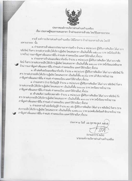 āļ›āļĢāļ°āļāļēāļĻāļ­āļ‡āļ„āđŒāļāļēāļĢāļšāļĢāļīāļŦāļēāļĢāļŠāđˆāļ§āļ™āļ•āļģāļšāļĨāļāđ‰āļēāļ™āđ€āļŦāļĨāļ·āļ­āļ‡ āđ€āļĢāļ·āđˆāļ­āļ‡ āļ›āļĢāļ°āļāļēāļĻāļœāļđāđ‰āļŠāļ™āļ°āļāļēāļĢāđ€āļŠāļ™āļ­āļĢāļēāļ„āļē āļˆāđ‰āļēāļ‡āļ–āđˆāļēāļĒāđ€āļ­āļāļŠāļēāļĢāđ€āļ‚āđ‰āļēāđ€āļĨāđˆāļĄ āđ‚āļ”āļĒāļ§āļīāļ˜āļĩāđ€āļ‰āļžāļĢāļēāļ°āđ€āļˆāļēāļ°āļˆāļ‡