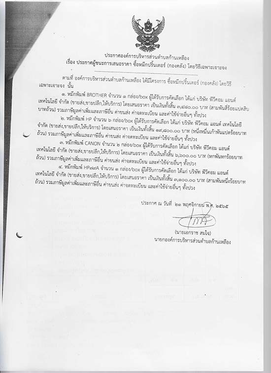 āļ›āļĢāļ°āļāļēāļĻāļ­āļ‡āļ„āđŒāļāļēāļĢāļšāļĢāļīāļŦāļēāļĢāļŠāđˆāļ§āļ™āļ•āļģāļšāļĨāļāđ‰āļēāļ™āđ€āļŦāļĨāļ·āļ­āļ‡ āđ€āļĢāļ·āđˆāļ­āļ‡ āļ›āļĢāļ°āļāļēāļĻāļœāļđāđ‰āļŠāļ™āļ°āļāļēāļĢāđ€āļŠāļ™āļ­āļĢāļēāļ„āļē āļ‹āļ·āđ‰āļ­āļŦāļĄāļķāļāļ›āļĢāļīāđ‰āļ™āđ€āļ•āļ­āļĢāđŒ (āļāļ­āļ‡āļ„āļĨāļąāļ‡) āđ‚āļ”āļĒāļ§āļīāļ˜āļĩāđ€āļ‰āļžāļēāļ°āđ€āļˆāļēāļ°āļˆāļ‡