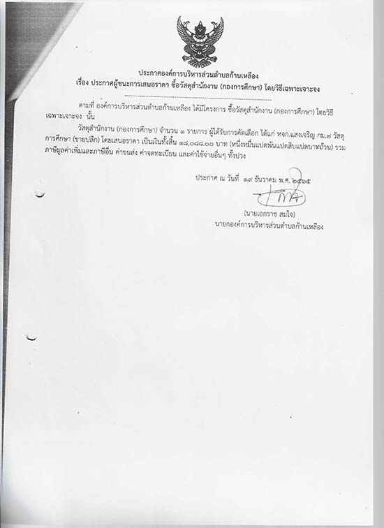 āļ›āļĢāļ°āļāļēāļĻāļ­āļ‡āļ„āđŒāļāļēāļĢāļšāļĢāļīāļŦāļēāļĢāļŠāđˆāļ§āļ™āļ•āļģāļšāļĨāļāđ‰āļēāļ™āđ€āļŦāļĨāļ·āļ­āļ‡ āđ€āļĢāļ·āđˆāļ­āļ‡ āļ›āļĢāļ°āļāļēāļĻāļœāļđāđ‰āļŠāļ™āļ°āļāļēāļĢāđ€āļŠāļ™āļ­āļĢāļēāļ„āļē āļ‹āļ·āđ‰āļ­āļ§āļąāļŠāļ”āļļāļŠāļģāļŦāļ™āļąāļāļ‡āļēāļ™ (āļāļ­āļ‡āļāļēāļĢāļĻāļķāļāļĐāļē) āđ‚āļ”āļĒāļ§āļīāļ˜āļĩāđ€āļ‰āļžāļēāļ°āđ€āļˆāļēāļ°āļˆāļ‡
