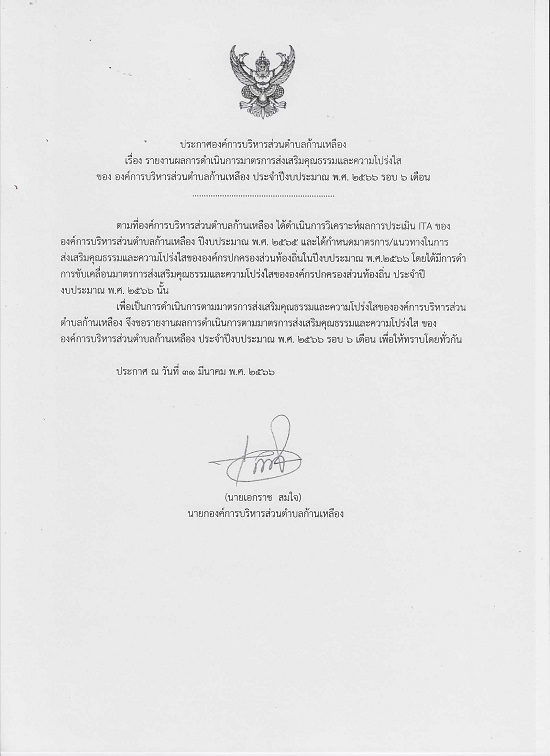 āļĢāļēāļĒāļ‡āļēāļ™āļœāļĨāļāļēāļĢāļ”āļģāđ€āļ™āļīāļ™āļāļēāļĢāļ•āļēāļĄāļĄāļēāļ•āļĢāļāļēāļĢāļŠāđˆāļ‡āđ€āļŠāļĢāļīāļĄāļ„āļļāļ“āļ˜āļĢāļĢāļĄāđāļĨāļ°āļ„āļ§āļēāļĄāđ‚āļ›āļĢāđˆāļ‡āđƒāļŠ āļž.āļĻ.2566 āļĢāļ­āļš 6 āđ€āļ”āļ·āļ­āļ™ āļ­āļ‡āļ„āđŒāļāļēāļĢāļšāļĢāļīāļŦāļēāļĢāļŠāđˆāļ§āļ™āļ•āļģāļšāļĨāļāđ‰āļēāļ™āđ€āļŦāļĨāļ·āļ­āļ‡ āļ­āļģāđ€āļ āļ­āļ­āļļāļ—āļļāļĄāļžāļĢāļžāļīāļŠāļąāļĒ āļˆāļąāļ‡āļŦāļ§āļąāļ”āļĻāļĢāļĩāļŠāļ°āđ€āļāļĐ