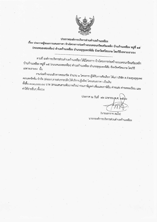 āļ›āļĢāļ°āļāļēāļĻāļ­āļ‡āļ„āđŒāļāļēāļĢāļšāļĢāļīāļŦāļēāļĢāļŠāđˆāļ§āļ™āļ•āļģāļšāļĨāļāđ‰āļēāļ™āđ€āļŦāļĨāļ·āļ­āļ‡ āđ€āļĢāļ·āđˆāļ­āļ‡ āļ›āļĢāļ°āļāļēāļĻāļœāļđāđ‰āļŠāļ™āļ°āļāļēāļĢāđ€āļŠāļ™āļ­āļĢāļēāļ„āļē āļˆāđ‰āļēāļ‡āđ‚āļ„āļĢāļ‡āļāđˆāļ­āļŠāļĢāđ‰āļēāļ‡āļ–āļ™āļ™āļ„āļ­āļ™āļāļĢāļĩāļ•āđ€āļŠāļĢāļīāļĄāđ€āļŦāļĨāđ‡āļ āļšāđ‰āļēāļ™āļāđ‰āļēāļ™āđ€āļŦāļĨāļ·āļ­āļ‡ āļŦāļĄāļđāđˆāļ—āļĩāđˆ 15 (āļ–āļ™āļ™āļŦāļ™āļ­āļ‡āļŠāļ­āļ‡āļŦāđ‰āļ­āļ‡) āļ•āļģāļšāļĨāļāđ‰āļēāļ™āđ€āļŦāļĨāļ·āļ­āļ‡ āļ­āļģāđ€āļ āļ­āļ­āļļāļ—āļļāļĄāļžāļĢāļžāļīāļŠāļąāļĒ āļˆāļąāļ‡āļŦāļ§āļąāļ”āļĻāļĢāļĩāļŠāļ°āđ€āļāļĐ āđ‚āļ”āļĒāļ§āļīāļ˜āļĩāđ€āļ‰āļžāļēāļ°āđ€āļˆāļēāļ°āļˆāļ‡