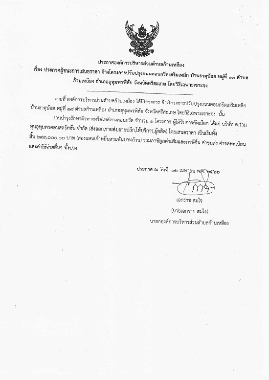 āļ›āļĢāļ°āļāļēāļĻāļ­āļ‡āļ„āđŒāļāļēāļĢāļšāļĢāļīāļŦāļēāļĢāļŠāđˆāļ§āļ™āļ•āļģāļšāļĨāļāđ‰āļēāļ™āđ€āļŦāļĨāļ·āļ­āļ‡ āđ€āļĢāļ·āđˆāļ­āļ‡ āļ›āļĢāļ°āļāļēāļĻāļœāļđāđ‰āļŠāļ™āļ°āļāļēāļĢāđ€āļŠāļ™āļ­āļĢāļēāļ„āļē āļˆāđ‰āļēāļ‡āđ‚āļ„āļĢāļ‡āļāļēāļĢāļ›āļĢāļąāļšāļ›āļĢāļļāļ‡āļ–āļ™āļ™āļ„āļ­āļ™āļāļĢāļĩāļ•āđ€āļŠāļĢāļīāļĄāđ€āļŦāļĨāđ‡āļ āļšāđ‰āļēāļ™āļ˜āļēāļ•āļļāļ™āđ‰āļ­āļĒ āļŦāļĄāļđāđˆāļ—āļĩāđˆ 17 āļ•āļģāļšāļĨāļāđ‰āļēāļ™āđ€āļŦāļĨāļ·āļ­āļ‡ āļ­āļģāđ€āļ āļ­āļ­āļļāļ—āļļāļĄāļžāļĢāļžāļīāļŠāļąāļĒ āļˆāļąāļ‡āļŦāļ§āļąāļ”āļĻāļĢāļĩāļŠāļ°āđ€āļāļĐ āđ‚āļ”āļĒāļ§āļīāļ˜āļĩāđ€āļ‰āļžāļēāļ°āđ€āļˆāļēāļ°āļˆāļ‡