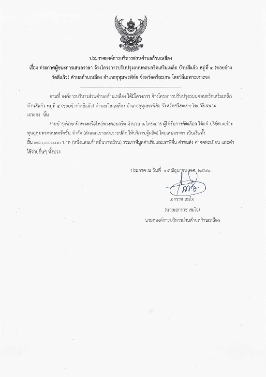 āļ›āļĢāļ°āļāļēāļĻāļ­āļ‡āļ„āđŒāļāļēāļĢāļšāļĢāļīāļŦāļēāļĢāļŠāđˆāļ§āļ™āļ•āļģāļšāļĨāļāđ‰āļēāļ™āđ€āļŦāļĨāļ·āļ­āļ‡ āđ€āļĢāļ·āđˆāļ­āļ‡ āļ›āļĢāļ°āļāļēāļĻāļœāļđāđ‰āļŠāļ™āļ°āļāļēāļĢāđ€āļŠāļ™āļ­āļĢāļēāļ„āļē āļˆāđ‰āļēāļ‡āđ‚āļ„āļĢāļ‡āļāļēāļĢāļ›āļĢāļąāļšāļ›āļĢāļļāļ‡āļ–āļ™āļ™āļ„āļ­āļ™āļāļĢāļĩāļ•āđ€āļŠāļĢāļīāļĄāđ€āļŦāļĨāđ‡āļ āļšāđ‰āļēāļ™āļŠāļĩāđāļāđ‰āļ§ āļŦāļĄāļđāđˆāļ—āļĩāđˆ 4 (āļ‹āļ­āļĒāļ‚āđ‰āļēāļ‡āļ§āļąāļ”āļŠāļĩāđāļāđ‰āļ§) āļ•āļģāļšāļĨāļāđ‰āļēāļ™āđ€āļŦāļĨāļ·āļ­āļ‡ āļ­āļģāđ€āļ āļ­āļ­āļļāļ—āļļāļĄāļžāļĢāļžāļīāļŠāļąāļĒ āļˆāļąāļ‡āļŦāļ§āļąāļ”āļĻāļĢāļĩāļŠāļ°āđ€āļāļĐ āđ‚āļ”āļĒāļ§āļīāļ˜āļĩāđ€āļ‰āļžāļēāļ°āđ€āļˆāļēāļ°āļˆāļ‡