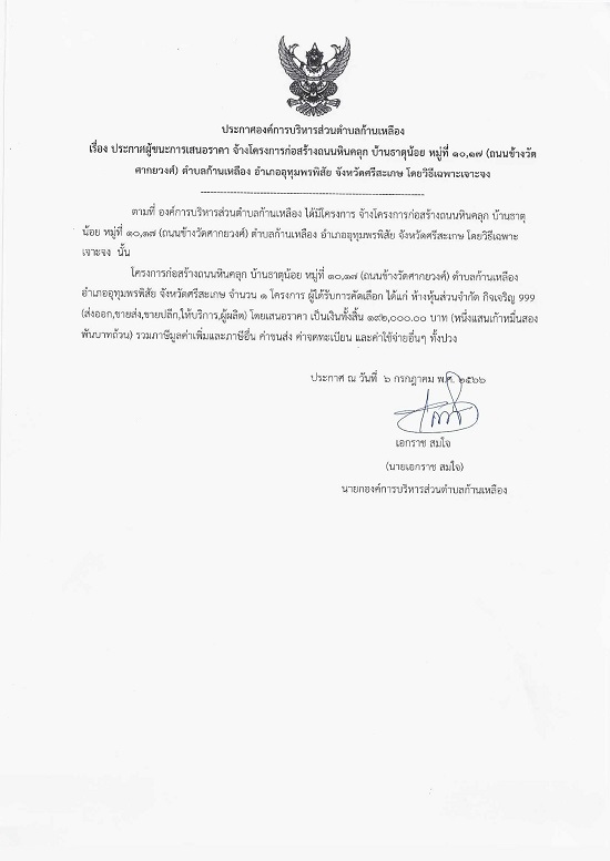 āļ›āļĢāļ°āļāļēāļĻāļ­āļ‡āļ„āđŒāļāļēāļĢāļšāļĢāļīāļŦāļēāļĢāļŠāđˆāļ§āļ™āļ•āļģāļšāļĨāļāđ‰āļēāļ™āđ€āļŦāļĨāļ·āļ­āļ‡ āđ€āļĢāļ·āđˆāļ­āļ‡ āļ›āļĢāļ°āļāļēāļĻāļœāļđāđ‰āļŠāļ™āļ°āļāļēāļĢāđ€āļŠāļ™āļ­āļĢāļēāļ„āļē āļˆāđ‰āļēāļ‡āđ‚āļ„āļĢāļ‡āļāļēāļĢāļāđˆāļ­āļŠāļĢāđ‰āļēāļ‡āļ–āļ™āļ™āļŦāļīāļ™āļ„āļĨāļļāļ āļšāđ‰āļēāļ™āļ˜āļēāļ•āļļāļ™āđ‰āļ­āļĒ āļŦāļĄāļđāđˆāļ—āļĩāđˆ 10,17 (āļ–āļ™āļ™āļ‚āđ‰āļēāļ‡āļ§āļąāļ”āļĻāļēāļāļĒāļēāļ§āļ‡āļĻāđŒ) āļ•āļģāļšāļĨāļāđ‰āļēāļ™āđ€āļŦāļĨāļ·āļ­āļ‡ āļ­āļģāđ€āļ āļ­āļ­āļļāļ—āļļāļĄāļžāļĢāļžāļīāļŠāļąāļĒ āļˆāļąāļ‡āļŦāļ§āļąāļ”āļĻāļĢāļĩāļŠāļ°āđ€āļāļĐ āđ‚āļ”āļĒāļ§āļīāļ˜āļĩāđ€āļ‰āļžāļēāļ°āđ€āļˆāļēāļ°āļˆāļ‡