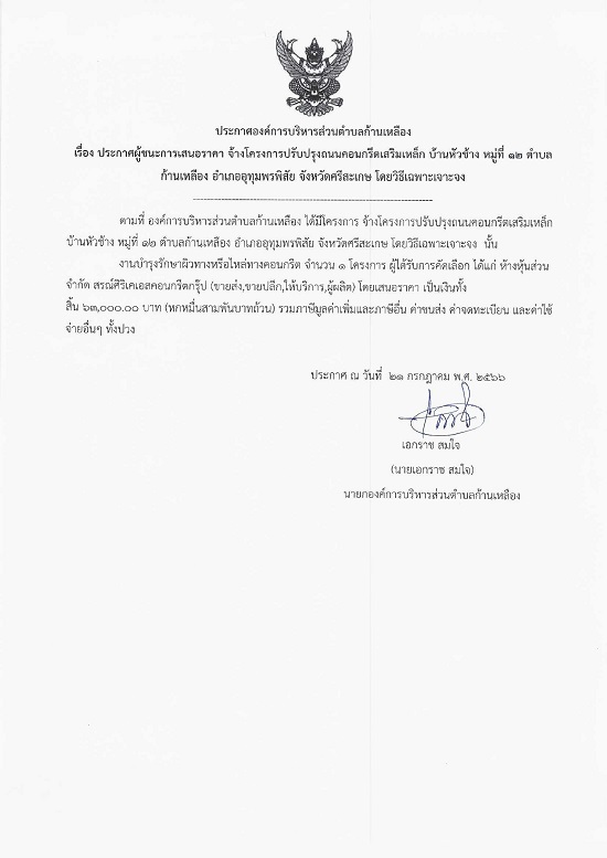 āļ›āļĢāļ°āļāļēāļĻāļ­āļ‡āļ„āđŒāļāļēāļĢāļšāļĢāļīāļŦāļēāļĢāļŠāđˆāļ§āļ™āļ•āļģāļšāļĨāļāđ‰āļēāļ™āđ€āļŦāļĨāļ·āļ­āļ‡ āđ€āļĢāļ·āđˆāļ­āļ‡ āļ›āļĢāļ°āļāļēāļĻāļœāļđāđ‰āļŠāļ™āļ°āļāļēāļĢāđ€āļŠāļ™āļ­āļĢāļēāļ„āļē āļˆāđ‰āļēāļ‡āđ‚āļ„āļĢāļ‡āļāļēāļĢāļ›āļĢāļąāļšāļ›āļĢāļļāļ‡āļ–āļ™āļ™āļ„āļ­āļ™āļāļĢāļĩāļ•āđ€āļŠāļĢāļīāļĄāđ€āļŦāļĨāđ‡āļ āļšāđ‰āļēāļ™āļŦāļąāļ§āļŠāđ‰āļēāļ‡ āļŦāļĄāļđāđˆāļ—āļĩāđˆ 12 āļ•āļģāļšāļĨāļāđ‰āļēāļ™āđ€āļŦāļĨāļ·āļ­āļ‡ āļ­āļģāđ€āļ āļ­āļ­āļļāļ—āļļāļĄāļžāļĢāļžāļīāļŠāļąāļĒ āļˆāļąāļ‡āļŦāļ§āļąāļ”āļĻāļĢāļĩāļŠāļ°āđ€āļāļĐ āđ‚āļ”āļĒāļ§āļīāļ˜āļĩāđ€āļ‰āļžāļēāļ°āđ€āļˆāļēāļ°āļˆāļ‡