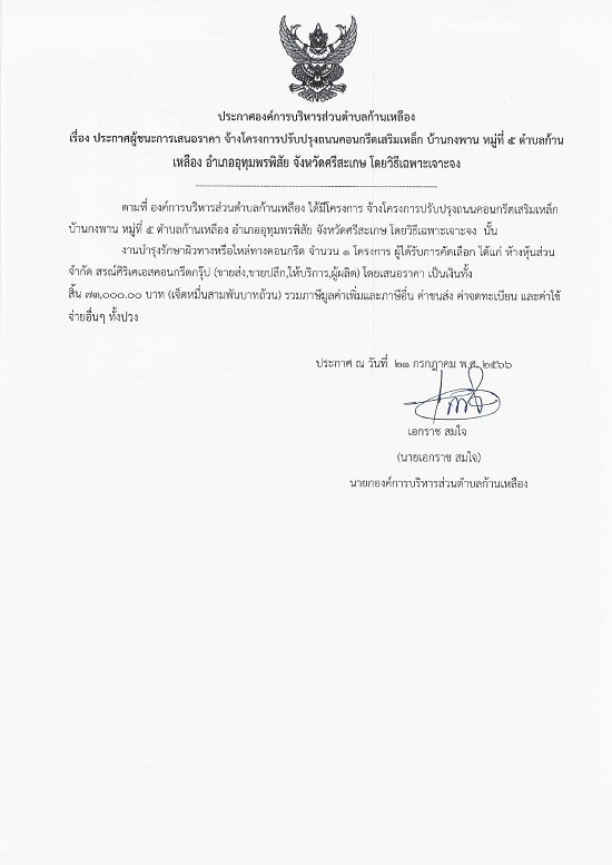 āļ›āļĢāļ°āļāļēāļĻāļ­āļ‡āļ„āđŒāļāļēāļĢāļšāļĢāļīāļŦāļēāļĢāļŠāđˆāļ§āļ™āļ•āļģāļšāļĨāļāđ‰āļēāļ™āđ€āļŦāļĨāļ·āļ­āļ‡ āđ€āļĢāļ·āđˆāļ­āļ‡ āļ›āļĢāļ°āļāļēāļĻāļœāļđāđ‰āļŠāļ™āļ°āļāļēāļĢāđ€āļŠāļ™āļ­āļĢāļēāļ„āļē āļˆāđ‰āļēāļ‡āđ‚āļ„āļĢāļ‡āļāļēāļĢāļ›āļĢāļąāļšāļ›āļĢāļļāļ‡āļ–āļ™āļ™āļ„āļ­āļ™āļāļĢāļĩāļ•āđ€āļŠāļĢāļīāļĄāđ€āļŦāļĨāđ‡āļ āļšāđ‰āļēāļ™āļāļ‡āļžāļēāļ™ āļŦāļĄāļđāđˆāļ—āļĩāđˆ 5 āļ•āļģāļšāļĨāļāđ‰āļēāļ™āđ€āļŦāļĨāļ·āļ­āļ‡ āļ­āļģāđ€āļ āļ­āļ­āļļāļ—āļļāļĄāļžāļĢāļžāļīāļŠāļąāļĒ āļˆāļąāļ‡āļŦāļ§āļąāļ”āļĻāļĢāļĩāļŠāļ°āđ€āļāļĐ āđ‚āļ”āļĒāļ§āļīāļ˜āļĩāđ€āļ‰āļžāļēāļ°āđ€āļˆāļēāļ°āļˆāļ‡
