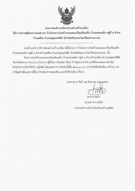 āļ›āļĢāļ°āļāļēāļĻāļ­āļ‡āļ„āđŒāļāļēāļĢāļšāļĢāļīāļŦāļēāļĢāļŠāđˆāļ§āļ™āļ•āļģāļšāļĨāļāđ‰āļēāļ™āđ€āļŦāļĨāļ·āļ­āļ‡ āđ€āļĢāļ·āđˆāļ­āļ‡ āļ›āļĢāļ°āļāļēāļĻāļœāļđāđ‰āļŠāļ™āļ°āļāļēāļĢāđ€āļŠāļ™āļ­āļĢāļēāļ„āļē āļˆāđ‰āļēāļ‡āđ‚āļ„āļĢāļ‡āļāļēāļĢāļāđˆāļ­āļŠāļĢāđ‰āļēāļ‡āļ–āļ™āļ™āļ„āļ­āļ™āļāļĢāļĩāļ•āđ€āļŠāļĢāļīāļĄāđ€āļŦāļĨāđ‡āļ āļšāđ‰āļēāļ™āļŦāļ™āļ­āļ‡āđ€āļŦāļĨāđ‡āļ āļŦāļĄāļđāđˆāļ—āļĩāđˆ 8 āļ•āļģāļšāļĨāļāđ‰āļēāļ™āđ€āļŦāļĨāļ·āļ­āļ‡ āļ­āļģāđ€āļ āļ­āļ­āļļāļ—āļļāļĄāļžāļĢāļžāļīāļŠāļąāļĒ āļˆāļąāļ‡āļŦāļ§āļąāļ”āļĻāļĢāļĩāļŠāļ°āđ€āļāļĐ āđ‚āļ”āļĒāļ§āļīāļ˜āļĩāđ€āļ‰āļžāļēāļ°āđ€āļˆāļēāļ°āļˆāļ‡