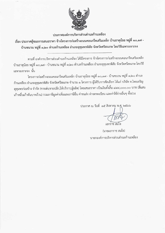 āļ›āļĢāļ°āļāļēāļĻāļ­āļ‡āļ„āđŒāļāļēāļĢāļšāļĢāļīāļŦāļēāļĢāļŠāđˆāļ§āļ™āļ•āļģāļšāļĨāļāđ‰āļēāļ™āđ€āļŦāļĨāļ·āļ­āļ‡ āđ€āļĢāļ·āđˆāļ­āļ‡ āļ›āļĢāļ°āļāļēāļĻāļœāļđāđ‰āļŠāļ™āļ°āļāļēāļĢāđ€āļŠāļ™āļ­āļĢāļēāļ„āļē āļˆāđ‰āļēāļ‡āđ‚āļ„āļĢāļ‡āļāļēāļĢāļāđˆāļ­āļŠāļĢāđ‰āļēāļ‡āļ–āļ™āļ™āļ„āļ­āļ™āļāļĢāļĩāļ•āđ€āļŠāļĢāļīāļĄāđ€āļŦāļĨāđ‡āļ āļšāđ‰āļēāļ™āļ˜āļēāļ•āļļāļ™āđ‰āļ­āļĒ āļŦāļĄāļđāđˆāļ—āļĩāđˆ 10,17 - āļšāđ‰āļēāļ™āļ‚āļ™āļ§āļ™ āļŦāļĄāļđāđˆāļ—āļĩāđˆ 3,20 āļ•āļģāļšāļĨāļāđ‰āļēāļ™āđ€āļŦāļĨāļ·āļ­āļ‡ āļ­āļģāđ€āļ āļ­āļ­āļļāļ—āļļāļĄāļžāļĢāļžāļīāļŠāļąāļĒ āļˆāļąāļ‡āļŦāļ§āļąāļ”āļĻāļĢāļĩāļŠāļ°āđ€āļāļĐ āđ‚āļ”āļĒāļ§āļīāļ˜āļĩāđ€āļ‰āļžāļēāļ°āđ€āļˆāļēāļ°āļˆāļ‡