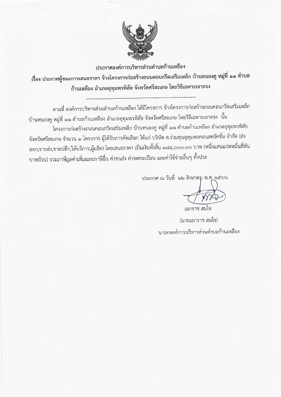 āļ›āļĢāļ°āļāļēāļĻāļ­āļ‡āļ„āđŒāļāļēāļĢāļšāļĢāļīāļŦāļēāļĢāļŠāđˆāļ§āļ™āļ•āļģāļšāļĨāļāđ‰āļēāļ™āđ€āļŦāļĨāļ·āļ­āļ‡ āđ€āļĢāļ·āđˆāļ­āļ‡ āļ›āļĢāļ°āļāļēāļĻāļœāļđāđ‰āļŠāļ™āļ°āļāļēāļĢāđ€āļŠāļ™āļ­āļĢāļēāļ„āļē āļˆāđ‰āļēāļ‡āđ‚āļ„āļĢāļ‡āļāļēāļĢāļāđˆāļ­āļŠāļĢāđ‰āļēāļ‡āļ–āļ™āļ™āļ„āļ­āļ™āļāļĢāļĩāļ•āđ€āļŠāļĢāļīāļĄāđ€āļŦāļĨāđ‡āļ āļšāđ‰āļēāļ™āļŦāļ™āļ­āļ‡āļ„āļđ āļŦāļĄāļđāđˆāļ—āļĩāđˆ 11 āļ•āļģāļšāļĨāļāđ‰āļēāļ™āđ€āļŦāļĨāļ·āļ­āļ‡ āļ­āļģāđ€āļ āļ­āļ­āļļāļ—āļļāļĄāļžāļĢāļžāļīāļŠāļąāļĒ āļˆāļąāļ‡āļŦāļ§āļąāļ”āļĻāļĢāļĩāļŠāļ°āđ€āļāļĐ āđ‚āļ”āļĒāļ§āļīāļ˜āļĩāđ€āļ‰āļžāļēāļ°āđ€āļˆāļēāļ°āļˆāļ‡