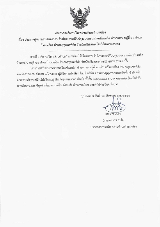 āļ›āļĢāļ°āļāļēāļĻāļ­āļ‡āļ„āđŒāļāļēāļĢāļšāļĢāļīāļŦāļēāļĢāļŠāđˆāļ§āļ™āļ•āļģāļšāļĨāļāđ‰āļēāļ™āđ€āļŦāļĨāļ·āļ­āļ‡ āđ€āļĢāļ·āđˆāļ­āļ‡ āļ›āļĢāļ°āļāļēāļĻāļœāļđāđ‰āļŠāļ™āļ°āļāļēāļĢāđ€āļŠāļ™āļ­āļĢāļēāļ„āļē āļˆāđ‰āļēāļ‡āđ‚āļ„āļĢāļ‡āļāļēāļĢāļāđˆāļ­āļŠāļĢāđ‰āļēāļ‡āļ–āļ™āļ™āļ„āļ­āļ™āļāļĢāļĩāļ•āđ€āļŠāļĢāļīāļĄāđ€āļŦāļĨāđ‡āļ āļšāđ‰āļēāļ™āļ‚āļ™āļ§āļ™ āļŦāļĄāļđāđˆāļ—āļĩāđˆ 20 āļ•āļģāļšāļĨāļāđ‰āļēāļ™āđ€āļŦāļĨāļ·āļ­āļ‡ āļ­āļģāđ€āļ āļ­āļ­āļļāļ—āļļāļĄāļžāļĢāļžāļīāļŠāļąāļĒ āļˆāļąāļ‡āļŦāļ§āļąāļ”āļĻāļĢāļĩāļŠāļ°āđ€āļāļĐ āđ‚āļ”āļĒāļ§āļīāļ˜āļĩāđ€āļ‰āļžāļēāļ°āđ€āļˆāļēāļ°āļˆāļ‡