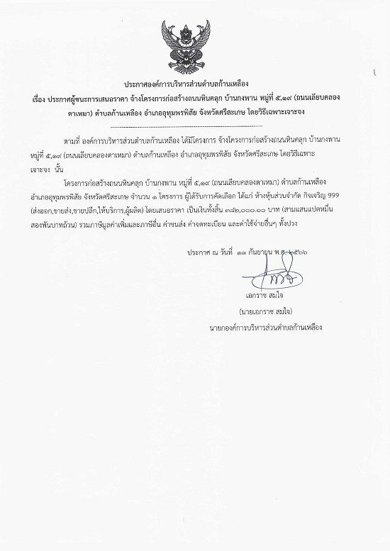 āļ›āļĢāļ°āļāļēāļĻāļ­āļ‡āļ„āđŒāļāļēāļĢāļšāļĢāļīāļŦāļēāļĢāļŠāđˆāļ§āļ™āļ•āļģāļšāļĨāļāđ‰āļēāļ™āđ€āļŦāļĨāļ·āļ­āļ‡ āđ€āļĢāļ·āđˆāļ­āļ‡ āļ›āļĢāļ°āļāļēāļĻāļœāļđāđ‰āļŠāļ™āļ°āļāļēāļĢāđ€āļŠāļ™āļ­āļĢāļēāļ„āļē āļˆāđ‰āļēāļ‡āđ‚āļ„āļĢāļ‡āļāļēāļĢāļāđˆāļ­āļŠāļĢāđ‰āļēāļ‡āļ–āļ™āļ™āļŦāļīāļ™āļ„āļĨāļļāļ āļšāđ‰āļēāļ™āļāļ‡āļžāļēāļ™ āļŦāļĄāļđāđˆāļ—āļĩāđˆ 5,19(āļ–āļ™āļ™āđ€āļĨāļĩāļĒāļšāļ„āļĨāļ­āļ‡āļ•āļēāđ€āļŦāļĄāļē) āļ•āļģāļšāļĨāļāđ‰āļēāļ™āđ€āļŦāļĨāļ·āļ­āļ‡ āļ­āļģāđ€āļ āļ­āļ­āļļāļ—āļļāļĄāļžāļĢāļžāļīāļŠāļąāļĒ āļˆāļąāļ‡āļŦāļ§āļąāļ”āļĻāļĢāļĩāļŠāļ°āđ€āļāļĐ āđ‚āļ”āļĒāļ§āļīāļ˜āļĩāđ€āļ‰āļžāļēāļ°āđ€āļˆāļēāļ°āļˆāļ‡