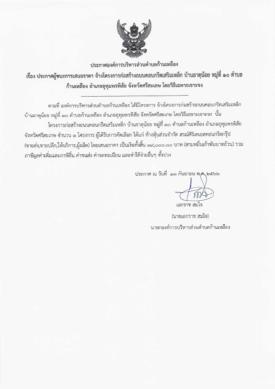 āļ›āļĢāļ°āļāļēāļĻāļ­āļ‡āļ„āđŒāļāļēāļĢāļšāļĢāļīāļŦāļēāļĢāļŠāđˆāļ§āļ™āļ•āļģāļšāļĨāļāđ‰āļēāļ™āđ€āļŦāļĨāļ·āļ­āļ‡ āđ€āļĢāļ·āđˆāļ­āļ‡ āļ›āļĢāļ°āļāļēāļĻāļœāļđāđ‰āļŠāļ™āļ°āļāļēāļĢāđ€āļŠāļ™āļ­āļĢāļēāļ„āļē āļˆāđ‰āļēāļ‡āđ‚āļ„āļĢāļ‡āļāļēāļĢāļāđˆāļ­āļŠāļĢāđ‰āļēāļ‡āļ–āļ™āļ™āļ„āļ­āļ™āļāļĢāļĩāļ•āđ€āļŠāļĢāļīāļĄāđ€āļŦāļĨāđ‡āļ āļšāđ‰āļēāļ™āļ˜āļēāļ•āļļāļ™āđ‰āļ­āļĒ āļŦāļĄāļđāđˆāļ—āļĩāđˆ 10 āļ•āļģāļšāļĨāļāđ‰āļēāļ™āđ€āļŦāļĨāļ·āļ­āļ‡ āļ­āļģāđ€āļ āļ­āļ­āļļāļ—āļļāļĄāļžāļĢāļžāļīāļŠāļąāļĒ āļˆāļąāļ‡āļŦāļ§āļąāļ”āļĻāļĢāļĩāļŠāļ°āđ€āļāļĐ āđ‚āļ”āļĒāļ§āļīāļ˜āļĩāđ€āļ‰āļžāļēāļ°āđ€āļˆāļēāļ°āļˆāļ‡