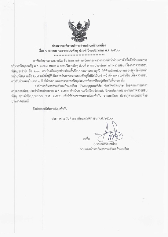 āļ›āļĢāļ°āļāļēāļĻāļ­āļ‡āļ„āđŒāļāļēāļĢāļšāļĢāļīāļŦāļēāļĢāļŠāđˆāļ§āļ™āļ•āļģāļšāļĨāļāđ‰āļēāļ™āđ€āļŦāļĨāļ·āļ­āļ‡ āđ€āļĢāļ·āđˆāļ­āļ‡ āļĢāļēāļĒāļ‡āļēāļ™āļāļēāļĢāļ•āļĢāļ§āļˆāļŠāļ­āļšāļžāļąāļŠāļ”āļļ āļ›āļĢāļ°āļˆāļģāļ›āļĩāļ‡āļšāļ›āļĢāļ°āļĄāļēāļ“ āļž.āļĻ. 2566