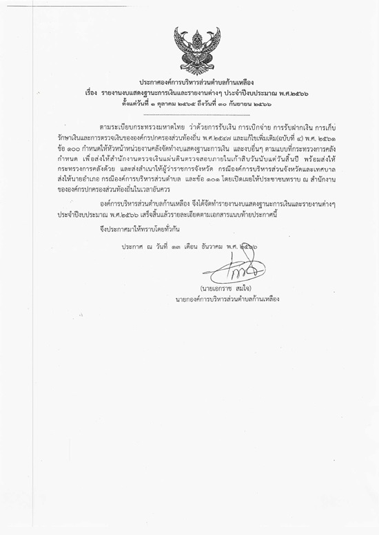 āļ›āļĢāļ°āļāļēāļĻāđŒāļ­āļ‡āļ„āđŒāļāļēāļĢāļšāļĢāļīāļŦāļēāļĢāļŠāđˆāļ§āļ™āļ•āļģāļĨāļāđ‰āļēāļ™āđ€āļŦāļĨāļ·āļ­āļ‡ āđ€āļĢāļ·āđˆāļ­āļ‡ āļĢāļēāļĒāļ‡āļēāļ™āļ‡āļšāđāļŠāļ”āļ‡āļāļēāļ™āļ°āļāļēāļĢāđ€āļ‡āļīāļ™āđāļĨāļ°āļĢāļēāļĒāļ‡āļēāļ™āļ•āđˆāļēāļ‡ āđ† āļ›āļĢāļ°āļˆāļģāļ›āļĩāļ‡āļšāļ›āļĢāļ°āļĄāļēāļ“ āļž.āļĻ.2566 āļ•āļąāđ‰āļ‡āđāļ•āđˆāļ§āļąāļ™āļ—āļĩāđˆ 1 āļ•āļļāļĨāļēāļ„āļĄ 2565 āļ–āļķāļ‡āļ§āļąāļ™āļ—āļĩāđˆ 30 āļāļąāļ™āļĒāļēāļĒāļ™ 2566