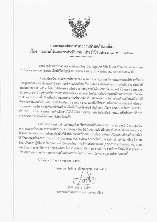 āļ›āļĢāļ°āļāļēāļĻāļ­āļ‡āļ„āđŒāļāļēāļĢāļšāļĢāļīāļŦāļēāļĢāļŠāđˆāļ§āļ™āļ•āļģāļšāļĨāļāđ‰āļēāļ™āđ€āļŦāļĨāļ·āļ­āļ‡ āđ€āļĢāļ·āđˆāļ­āļ‡ āļ›āļĢāļ°āļāļēāļĻāđƒāļŠāđ‰āđāļœāļ™āļāļēāļĢāļ”āļģāđ€āļ™āļīāļ™āļ‡āļēāļ™ āļ›āļĢāļ°āļˆāļģāļ›āļĩāļ‡āļšāļ›āļĢāļ°āļĄāļēāļ“ āļž.āļĻ.2567