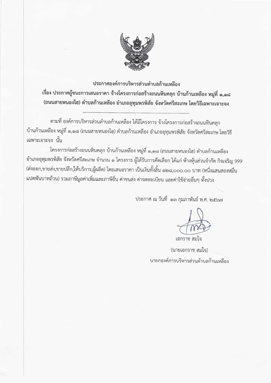 āļ›āļĢāļ°āļāļēāļĻāļ­āļ‡āļ„āđŒāļāļēāļĢāļšāļĢāļīāļŦāļēāļĢāļŠāđˆāļ§āļ™āļ•āļģāļšāļĨāļāđ‰āļēāļ™āđ€āļŦāļĨāļ·āļ­āļ‡ āđ€āļĢāļ·āđˆāļ­āļ‡ āļ›āļĢāļ°āļāļēāļĻāļœāļđāđ‰āļŠāļ™āļ°āļāļēāļĢāđ€āļŠāļ™āļ­āļĢāļēāļ„āļē āļˆāđ‰āļēāļ‡āđ‚āļ„āļĢāļ‡āļāļēāļĢāļāđˆāļ­āļŠāļĢāđ‰āļēāļ‡āļ–āļ™āļ™āļŦāļīāļ™āļ„āļĨāļļāļ āļšāđ‰āļēāļ™āļāđ‰āļēāļ™āđ€āļŦāļĨāļ·āļ­āļ‡ āļŦāļĄāļđāđˆāļ—āļĩāđˆ 1,18 (āļ–āļ™āļ™āļŦāļ™āļ­āļ‡āđ„āļŪ) āļ•āļģāļšāļĨāļāđ‰āļēāļ™āđ€āļŦāļĨāļ·āļ­āļ‡ āļ­āļģāđ€āļ āļ­āļ­āļļāļ—āļļāļĄāļžāļĢāļžāļīāļŠāļąāļĒ āļˆāļąāļ‡āļŦāļ§āļąāļ”āļĻāļĢāļĩāļŠāļ°āđ€āļāļĐ āđ‚āļ”āļĒāļ§āļīāļ˜āļĩāđ€āļ‰āļžāļēāļ°āđ€āļˆāļēāļ°āļˆāļ‡