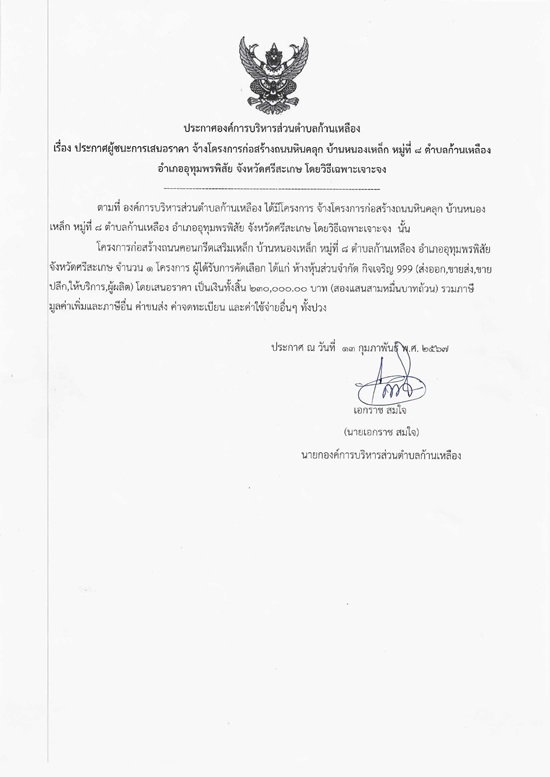 āļ›āļĢāļ°āļāļēāļĻāļ­āļ‡āļ„āđŒāļāļēāļĢāļšāļĢāļīāļŦāļēāļĢāļŠāđˆāļ§āļ™āļ•āļģāļšāļĨāļāđ‰āļēāļ™āđ€āļŦāļĨāļ·āļ­āļ‡ āđ€āļĢāļ·āđˆāļ­āļ‡ āļ›āļĢāļ°āļāļēāļĻāļœāļđāđ‰āļŠāļ™āļ°āļāļēāļĢāđ€āļŠāļ™āļ­āļĢāļēāļ„āļē āļˆāđ‰āļēāļ‡āđ‚āļ„āļĢāļ‡āļāļēāļĢāļāđˆāļ­āļŠāļĢāđ‰āļēāļ‡āļ–āļ™āļ™āļŦāļīāļ™āļ„āļĨāļļāļ āļšāđ‰āļēāļ™āļŦāļ™āļ­āļ‡āđ€āļŦāļĨāđ‡āļ āļŦāļĄāļđāđˆāļ—āļĩāđˆ 8 āļ•āļģāļšāļĨāļāđ‰āļēāļ™āđ€āļŦāļĨāļ·āļ­āļ‡ āļ­āļģāđ€āļ āļ­āļ­āļļāļ—āļļāļĄāļžāļĢāļžāļīāļŠāļąāļĒ āļˆāļąāļ‡āļŦāļ§āļąāļ”āļĻāļĢāļĩāļŠāļ°āđ€āļāļĐ āđ‚āļ”āļĒāļ§āļīāļ˜āļĩāđ€āļ‰āļžāļēāļ°āđ€āļˆāļēāļ°āļˆāļ‡