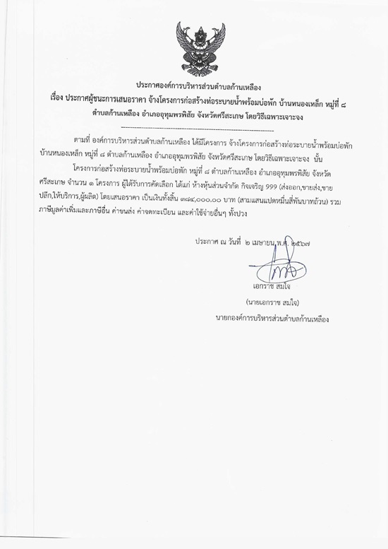 āļ›āļĢāļ°āļāļēāļĻāļ­āļ‡āļ„āđŒāļāļēāļĢāļšāļĢāļīāļŦāļēāļĢāļŠāđˆāļ§āļ™āļ•āļģāļšāļĨāļāđ‰āļēāļ™āđ€āļŦāļĨāļ·āļ­āļ‡ āđ€āļĢāļ·āđˆāļ­āļ‡ āļ›āļĢāļ°āļāļēāļĻāļœāļđāđ‰āļŠāļ™āļ°āļāļēāļĢāđ€āļŠāļ™āļ­āļĢāļēāļ„āļē āļˆāđ‰āļēāļ‡āđ‚āļ„āļĢāļ‡āļāļēāļĢāļāđˆāļ­āļŠāļĢāđ‰āļēāļ‡āļ—āđˆāļ­āļĢāļ°āļšāļēāļĒāļ™āđ‰āļģāļžāļĢāđ‰āļ­āļĄāļšāđˆāļ­āļžāļąāļ āļšāđ‰āļēāļ™āļŦāļ™āļ­āļ‡āđ€āļŦāļĨāđ‡āļ āļŦāļĄāļđāđˆāļ—āļĩāđˆ 8 āļ•āļģāļšāļĨāļāđ‰āļēāļ™āđ€āļŦāļĨāļ·āļ­āļ‡ āļ­āļģāđ€āļ āļ­āļ­āļļāļ—āļļāļĄāļžāļĢāļžāļīāļŠāļąāļĒ āļˆāļąāļ‡āļŦāļ§āļąāļ”āļĻāļĢāļĩāļŠāļ°āđ€āļāļĐ āđ‚āļ”āļĒāļ§āļīāļ˜āļĩāđ€āļ‰āļžāļēāļ°āđ€āļˆāļēāļ°āļˆāļ‡