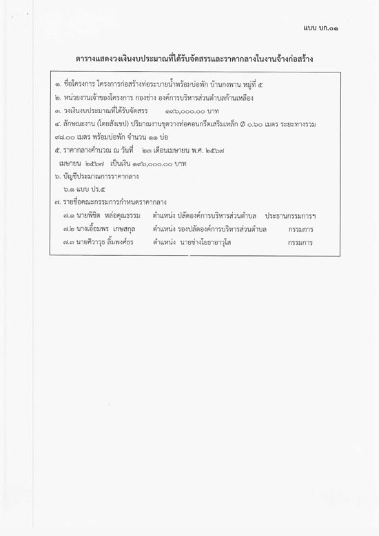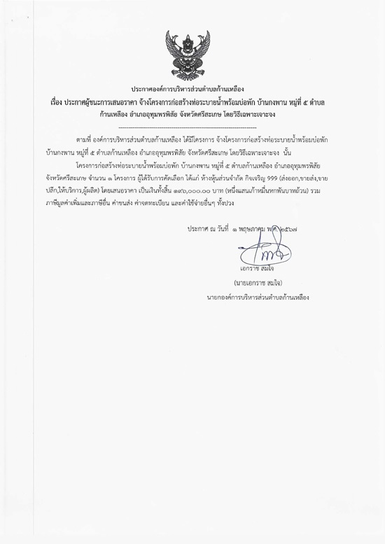 āļ›āļĢāļ°āļāļēāļĻāļ­āļ‡āļ„āđŒāļāļēāļĢāļšāļĢāļīāļŦāļēāļĢāļŠāđˆāļ§āļ™āļ•āļģāļšāļĨāļāđ‰āļēāļ™āđ€āļŦāļĨāļ·āļ­āļ‡ āđ€āļĢāļ·āđˆāļ­āļ‡ āđ€āļ›āļīāļ”āđ€āļœāļĒāļĢāļēāļ„āļēāļāļĨāļēāļ‡ āļˆāđ‰āļēāļ‡āđ‚āļ„āļĢāļ‡āļāļēāļĢāļāđˆāļ­āļŠāļĢāđ‰āļēāļ‡āļ—āđˆāļ­āļĢāļ°āļšāļēāļĒāļ™āđ‰āļģāļžāļĢāđ‰āļ­āļĄāļšāđˆāļ­āļžāļąāļ āļšāđ‰āļēāļ™āļāļ‡āļžāļēāļ™ āļŦāļĄāļđāđˆāļ—āļĩāđˆ 5 āļ•āļģāļšāļĨāļāđ‰āļēāļ™āđ€āļŦāļĨāļ·āļ­āļ‡ āļ­āļģāđ€āļ āļ­āļ­āļļāļ—āļļāļĄāļžāļĢāļžāļīāļŠāļąāļĒ āļˆāļąāļ‡āļŦāļ§āļąāļ”āļĻāļĢāļĩāļŠāļ°āđ€āļāļĐ āđ‚āļ”āļĒāļ§āļīāļ˜āļĩāđ€āļ‰āļžāļĢāļēāļ°āđ€āļˆāļēāļ°āļˆāļ‡