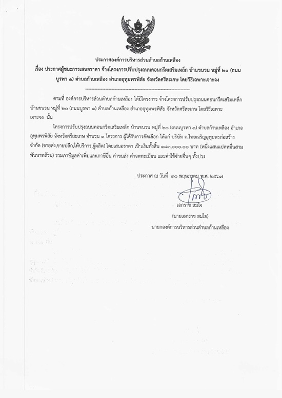 āļ›āļĢāļ°āļāļēāļĻāļ­āļ‡āļ„āđŒāļāļēāļĢāļšāļĢāļīāļŦāļēāļĢāļŠāđˆāļ§āļ™āļ•āļģāļšāļĨāļāđ‰āļēāļ™āđ€āļŦāļĨāļ·āļ­āļ‡ āđ€āļĢāļ·āđˆāļ­āļ‡ āļ›āļĢāļ°āļāļēāļĻāļœāļđāđ‰āļŠāļ™āļ°āļāļēāļĢāđ€āļŠāļ™āļ­āļĢāļēāļ„āļē āļˆāđ‰āļēāļ‡āđ‚āļ„āļĢāļ‡āļāļēāļĢāļ›āļĢāļąāļšāļ›āļĢāļļāļ‡āļ–āļ™āļ™āļ„āļ­āļ™āļāļĢāļĩāļ•āđ€āļŠāļĢāļīāļĄāđ€āļŦāļĨāđ‡āļ āļšāđ‰āļēāļ™āļ‚āļ™āļ§āļ™ āļŦāļĄāļđāđˆāļ—āļĩāđˆ 20 (āļ–āļ™āļ™āļšāļđāļĢāļ āļē 1) āļ•āļģāļšāļĨāļāđ‰āļēāļ™āđ€āļŦāļĨāļ·āļ­āļ‡ āļ­āļģāđ€āļ āļ­āļ­āļļāļ—āļļāļĄāļžāļĢāļžāļīāļŠāļąāļĒ āļˆāļąāļ‡āļŦāļ§āļąāļ”āļĻāļĢāļĩāļŠāļ°āđ€āļāļĐ āđ‚āļ”āļĒāļ§āļīāļ˜āļĩāđ€āļ‰āļžāļēāļ°āđ€āļˆāļēāļ°āļˆāļ‡