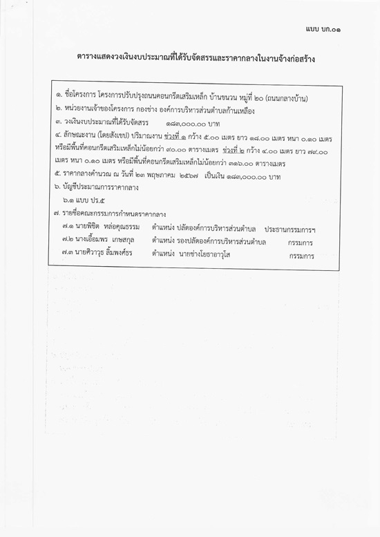 āļ›āļĢāļ°āļāļēāļĻāļ­āļ‡āļ„āđŒāļāļēāļĢāļšāļĢāļīāļŦāļēāļĢāļŠāđˆāļ§āļ™āļ•āļģāļšāļĨāļāđ‰āļēāļ™āđ€āļŦāļĨāļ·āļ­āļ‡ āđ€āļĢāļ·āđˆāļ­āļ‡ āđ€āļ›āļīāļ”āđ€āļœāļĒāļĢāļēāļ„āļēāļāļĨāļēāļ‡ āļˆāđ‰āļēāļ‡āđ‚āļ„āļĢāļ‡āļāļēāļĢāļ›āļĢāļąāļšāļ›āļĢāļļāļ‡āļ–āļ™āļ™āļ„āļ­āļ™āļāļĢāļĩāļ•āđ€āļŠāļĢāļīāļĄāđ€āļŦāļĨāđ‡āļ āļšāđ‰āļēāļ™āļ‚āļ™āļ§āļ™ āļŦāļĄāļđāđˆāļ—āļĩāđˆ 20 (āļ–āļ™āļ™āļāļĨāļēāļ‡āļšāđ‰āļēāļ™) āļ•āļģāļšāļĨāļāđ‰āļēāļ™āđ€āļŦāļĨāļ·āļ­āļ‡ āļ­āļģāđ€āļ āļ­āļ­āļļāļ—āļļāļĄāļžāļĢāļžāļīāļŠāļąāļĒ āļˆāļąāļ‡āļŦāļ§āļąāļ”āļĻāļĢāļĩāļŠāļ°āđ€āļāļĐ āđ‚āļ”āļĒāļ§āļīāļ˜āļĩāđ€āļ‰āļžāļēāļ°āđ€āļˆāļēāļ°āļˆāļ‡