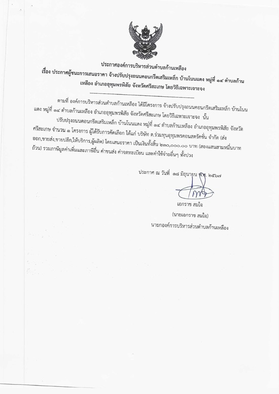 āļ›āļĢāļ°āļāļēāļĻāļ­āļ‡āļ„āđŒāļāļēāļĢāļšāļĢāļīāļŦāļēāļĢāļŠāđˆāļ§āļ™āļ•āļģāļšāļĨāļāđ‰āļēāļ™āđ€āļŦāļĨāļ·āļ­āļ‡ āđ€āļĢāļ·āđˆāļ­āļ‡ āļ›āļĢāļ°āļāļēāļĻāļœāļđāđ‰āļŠāļ™āļ°āļāļēāļĢāđ€āļŠāļ™āļ­āļĢāļēāļ„āļē āļˆāđ‰āļēāļ‡āđ‚āļ„āļĢāļ‡āļāļēāļĢāļ›āļĢāļąāļšāļ›āļĢāļļāļ‡āļ–āļ™āļ™āļ„āļ­āļ™āļāļĢāļĩāļ•āđ€āļŠāļĢāļīāļĄāđ€āļŦāļĨāđ‡āļ āļšāđ‰āļēāļ™āđ‚āļ™āļ™āđāļ”āļ‡ āļŦāļĄāļđāđˆāļ—āļĩāđˆ 14 āļ•āļģāļšāļĨāļāđ‰āļēāļ™āđ€āļŦāļĨāļ·āļ­āļ‡ āļ­āļģāđ€āļ āļ­āļ­āļļāļ—āļļāļĄāļžāļĢāļžāļīāļŠāļąāļĒ āļˆāļąāļ‡āļŦāļ§āļąāļ”āļĻāļĢāļĩāļŠāļ°āđ€āļāļĐ āđ‚āļ”āļĒāļ§āļīāļ˜āļĩāđ€āļ‰āļžāļēāļ°āđ€āļˆāļēāļ°āļˆāļ‡