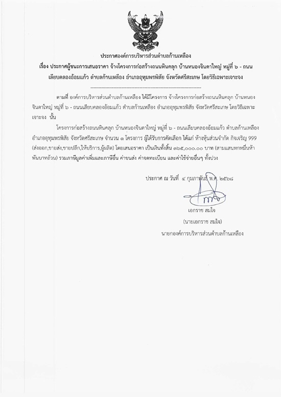āļ›āļĢāļ°āļāļēāļĻāļ­āļ‡āļ„āđŒāļāļēāļĢāļšāļĢāļīāļŦāļēāļĢāļŠāđˆāļ§āļ™āļ•āļģāļšāļĨāļāđ‰āļēāļ™āđ€āļŦāļĨāļ·āļ­āļ‡ āđ€āļĢāļ·āđˆāļ­āļ‡ āļ›āļĢāļ°āļāļēāļĻāļœāļđāđ‰āļŠāļ™āļ°āļāļēāļĢāđ€āļŠāļ™āļ­āļĢāļēāļ„āļē āļˆāđ‰āļēāļ‡āđ‚āļ„āļĢāļ‡āļāļēāļĢāļāđˆāļ­āļŠāļĢāđ‰āļēāļ‡āļ–āļ™āļ™āļŦāļīāļ™āļ„āļĨāļļāļ āļšāđ‰āļēāļ™āļŦāļ™āļ­āļ‡āļˆāļīāļ™āļ”āļēāđƒāļŦāļāđˆ āļŦāļĄāļđāđˆāļ—āļĩāđˆ 6 - āļ–āļ™āļ™āđ€āļĨāļĩāļĒāļšāļ„āļĨāļ­āļ‡āļ­āđ‰āļ­āļĄāđāļāđ‰āļ§ āļ•āļģāļšāļĨāļāđ‰āļēāļ™āđ€āļŦāļĨāļ·āļ­āļ‡ āļ­āļģāđ€āļ āļ­āļ­āļļāļ—āļļāļĄāļžāļĢāļžāļīāļŠāļąāļĒ āļˆāļąāļ‡āļŦāļ§āļąāļ”āļĻāļĢāļĩāļŠāļ°āđ€āļāļĐ āđ‚āļ”āļĒāļ§āļīāļ˜āļĩāđ€āļ‰āļžāļēāļ°āđ€āļˆāļēāļ°āļˆāļ‡