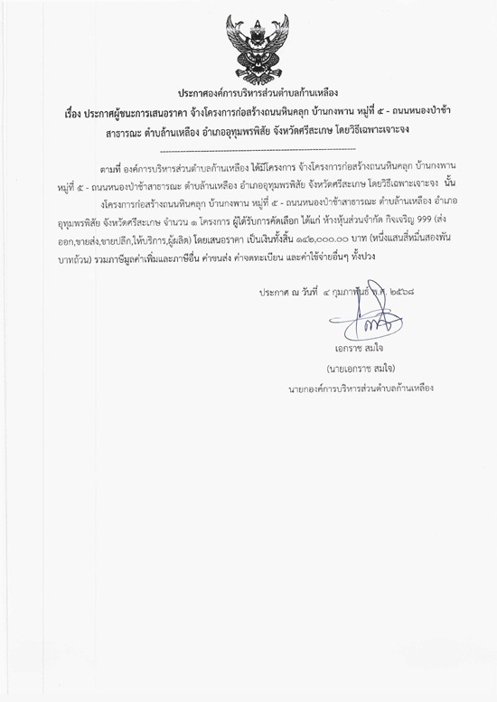 āļ›āļĢāļ°āļāļēāļĻāļ­āļ‡āļ„āđŒāļāļēāļĢāļšāļĢāļīāļŦāļēāļĢāļŠāđˆāļ§āļ™āļ•āļģāļšāļĨāļāđ‰āļēāļ™āđ€āļŦāļĨāļ·āļ­āļ‡ āđ€āļĢāļ·āđˆāļ­āļ‡ āļ›āļĢāļ°āļāļēāļĻāļœāļđāđ‰āļŠāļ™āļ°āļāļēāļĢāđ€āļŠāļ™āļ­āļĢāļēāļ„āļē āļˆāđ‰āļēāļ‡āđ‚āļ„āļĢāļ‡āļāļēāļĢāļāđˆāļ­āļŠāļĢāđ‰āļēāļ‡āļ–āļ™āļ™āļŦāļīāļ™āļ„āļĨāļļāļ āļšāđ‰āļēāļ™āļāļ‡āļžāļēāļ™ āļŦāļĄāļđāđˆāļ—āļĩāđˆ 5 - āļ–āļ™āļ™āđ€āļ›āđ‰āļēāļŠāđ‰āļēāļŠāļēāļ˜āļēāļĢāļ“āļ° āļ•āļģāļšāļĨāļāđ‰āļēāļ™āđ€āļŦāļĨāļ·āļ­āļ‡ āļ­āļģāđ€āļ āļ­āļ­āļļāļ—āļļāļĄāļžāļĢāļžāļīāļŠāļąāļĒ āļˆāļąāļ‡āļŦāļ§āļąāļ”āļĻāļĢāļĩāļŠāļ°āđ€āļāļĐ āđ‚āļ”āļĒāļ§āļīāļ˜āļĩāđ€āļ‰āļžāļēāļ°āđ€āļˆāļēāļ°āļˆāļ‡