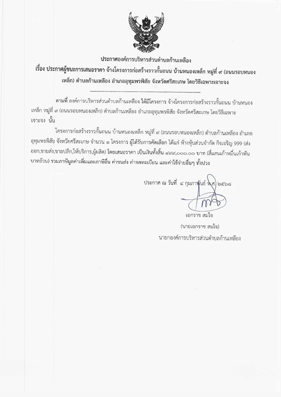 āļ›āļĢāļ°āļāļēāļĻāļ­āļ‡āļ„āđŒāļāļēāļĢāļšāļĢāļīāļŦāļēāļĢāļŠāđˆāļ§āļ™āļ•āļģāļšāļĨāļāđ‰āļēāļ™āđ€āļŦāļĨāļ·āļ­āļ‡ āđ€āļĢāļ·āđˆāļ­āļ‡ āļ›āļĢāļ°āļāļēāļĻāļœāļđāđ‰āļŠāļ™āļ°āļāļēāļĢāđ€āļŠāļ™āļ­āļĢāļēāļ„āļē āļˆāđ‰āļēāļ‡āđ‚āļ„āļĢāļ‡āļāļēāļĢāļāđˆāļ­āļŠāļĢāđ‰āļēāļ‡āļĢāļēāļ§āļāļąāđ‰āļ™āļ–āļ™āļ™ āļšāđ‰āļēāļ™āļŦāļ™āļ­āļ‡āđ€āļŦāļĨāđ‡āļ āļŦāļĄāļđāđˆāļ—āļĩāđˆ 9 (āļ–āļ™āļ™āļĢāļ­āļšāļŦāļ™āļ­āļ‡āđ€āļŦāļĨāđ‡āļ) āļ•āļģāļšāļĨāļāđ‰āļēāļ™āđ€āļŦāļĨāļ·āļ­āļ‡ āļ­āļģāđ€āļ āļ­āļ­āļļāļ—āļļāļĄāļžāļĢāļžāļīāļŠāļąāļĒ āļˆāļąāļ‡āļŦāļ§āļąāļ”āļĻāļĢāļĩāļŠāļ°āđ€āļāļĐ āđ‚āļ”āļĒāļ§āļīāļ˜āļĩāđ€āļ‰āļžāļēāļ°āđ€āļˆāļēāļ°āļˆāļ‡